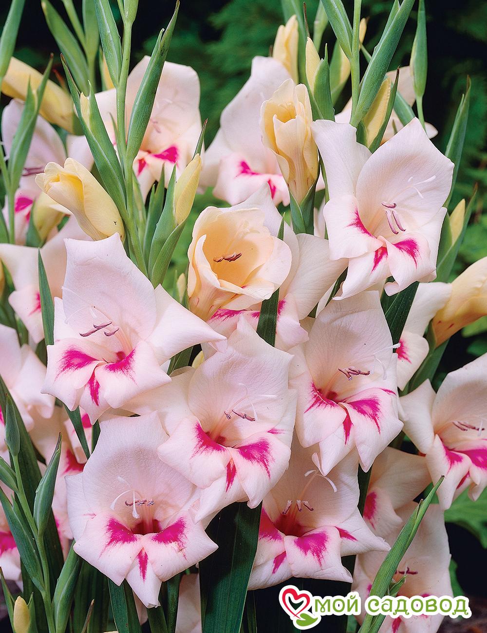 Гладиолус Карин (Carine) Растение с нежными цветами белой окраски и фиолетовой серединой. Высота растения колеблется от 45 до 60 сантиметров. Оптимальная почва: хорошо дренированная, мульчированная. Особенности ухода: хороший полив, но без застоя воды, применение микроудобрений, рыхление почвы, прополка сорняков. Особенности размножения: детками, образующимися вокруг клубнелуковиц. Возможно и семенное размножение для выведения новых сортов. Применение: в ландшафтном дизайне для создания уютных красивых дворов, в садах. Из них собираются невероятно шикарные букеты. Посадка. Из-за погодно-климатических особенностей в разных регионах России сроки посадки отличаются: На Юге (Краснодарский край (Кубань), Северный Кавказ) — сажать можно уже в конце апреля. В Средней полосе (в т. ч. Подмосковье) — оптимальное время приходится на начало или середину мая. В Сибири, на Урале, в Ленинградской области — в середине или конце мая. Места посадки должны быть солнечными, без сквозняков и с качественно дренированной почвой. Затенённые участки плохо сказываются на развитии культуры. Однако в южных районах небольшое затенение допускается. Глубина высадки луковиц обычно составляет 8-10 см (для мелких), 10-15 см (для крупных). Полив. Средняя частота поливов культуры составляет раз в неделю, а летом, в жаркие дни, один раз в 3-4 суток. Поливают утром или вечером, используя около 10-12 л воды на 1 м2. Полив производят в специально подготовленные междурядные борозды, углублённые до 30-50 мм с тем, чтобы капли воды не попадали на листики гладиолусов. Без регулярного полива цветы быстро завянут. По завершении процедуры кусты окучивают. Раз в декаду обязательно производят рыхление почвы.